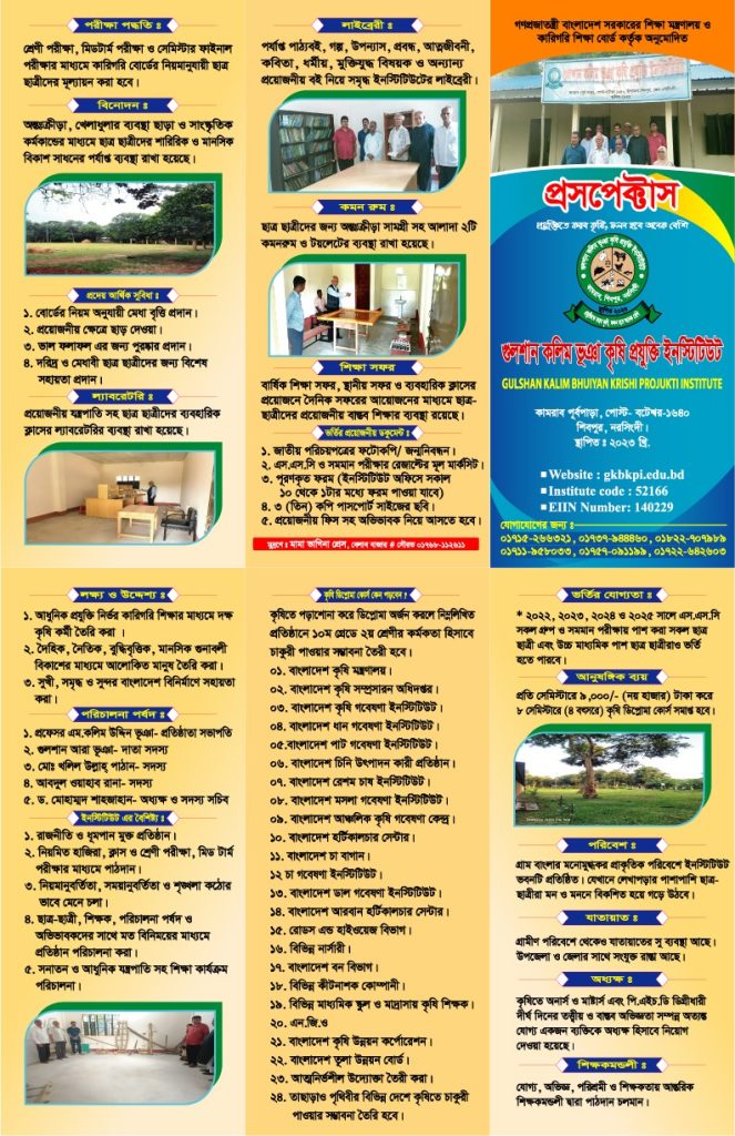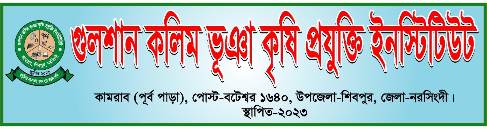 গুলশান কলিম ভূঞা কৃষি প্রযুক্তি ইনস্টিটিউটে ৪ বছরের কৃষি ডিপ্লোমা কোর্সে প্রথম বর্ষের ছাত্র-ছাত্রী ভর্তি শুরু হয়েছে। বিস্তারিত জানতে অফিসে (সকাল ১০ টা থেকে ১ টা) যোগাযোগ করুন। সকল বিষয়ে যোগ্য ও অভিজ্ঞ শিক্ষক নিয়োগ করা হয়েছে। কিছু শিক্ষার্থী ইতিমধ্যে ভর্তি হয়েছে।